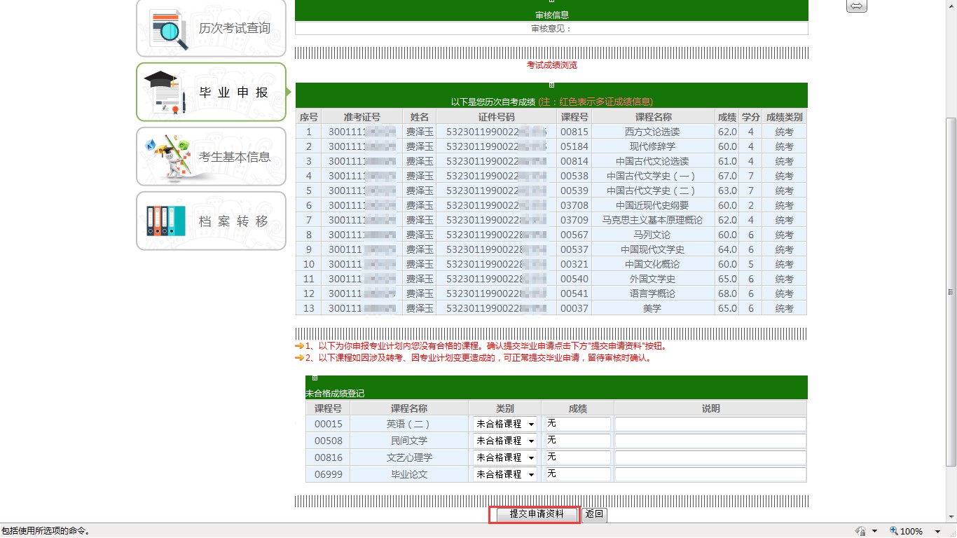(三)提交申请材料 在考生成绩显示界面(如图3-2)上,点击“提交申请资料”按钮,完成毕业申请提交。