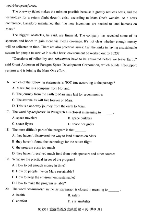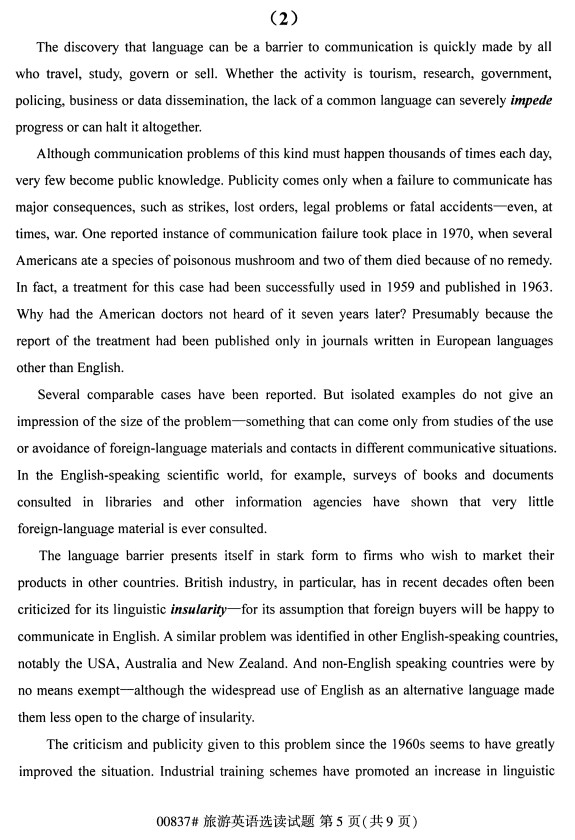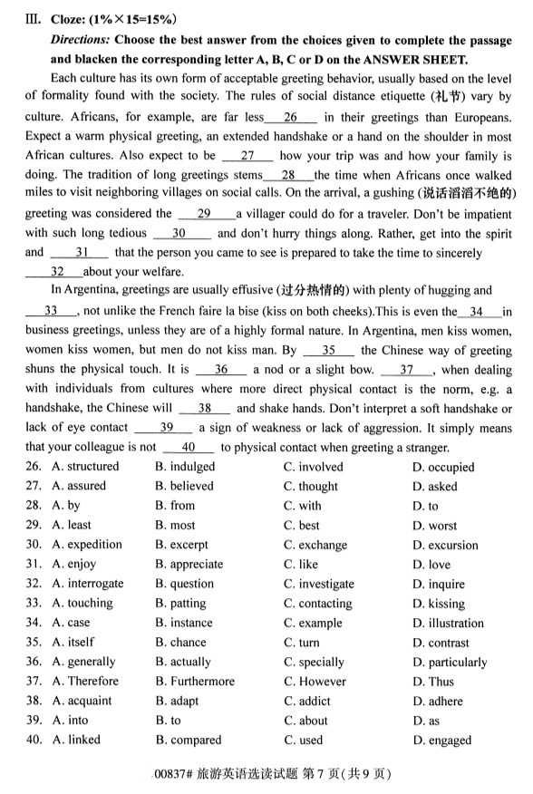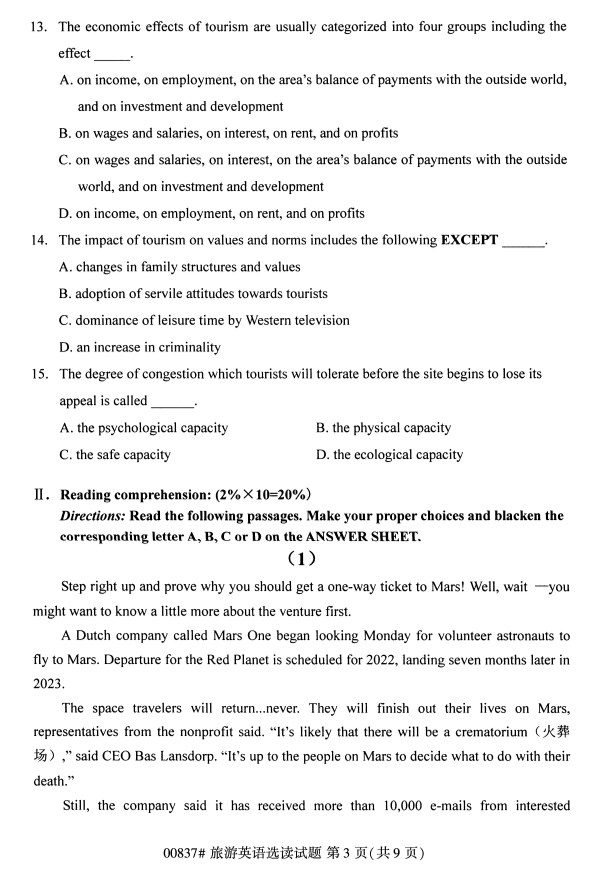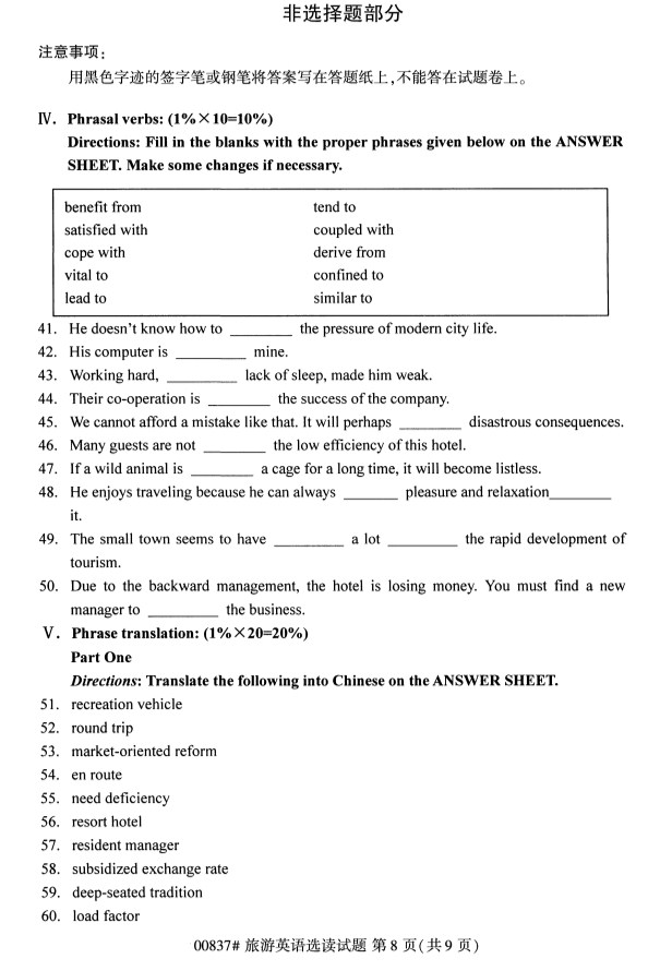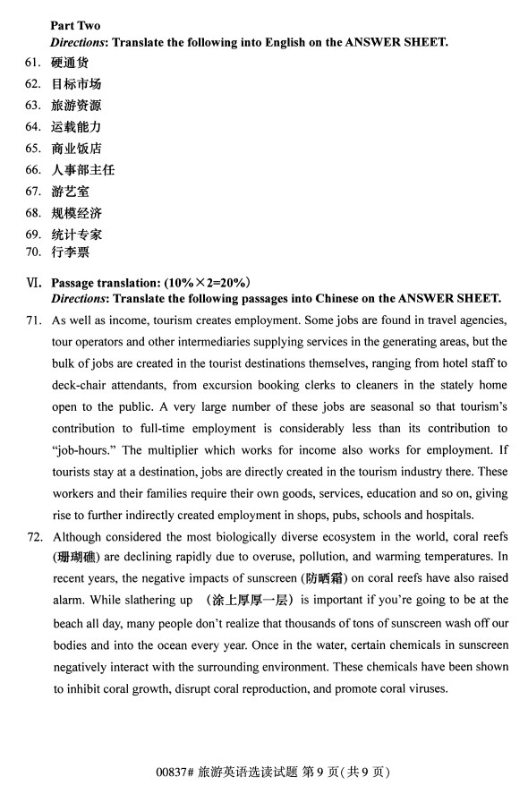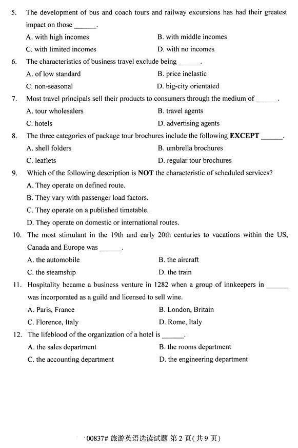 全国2019年10月自考00837旅游英语选读试题
