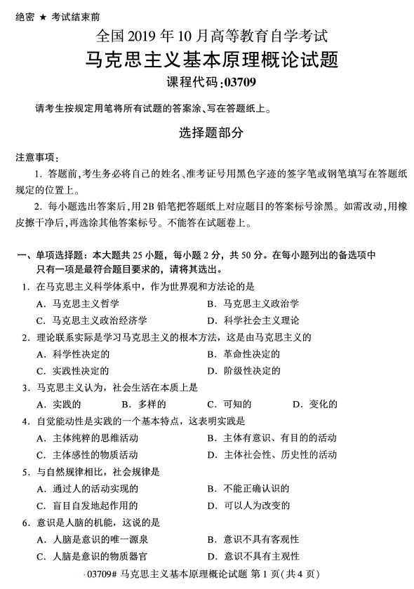 全国2019年10月自考03709马克思主义基本原理概论试题