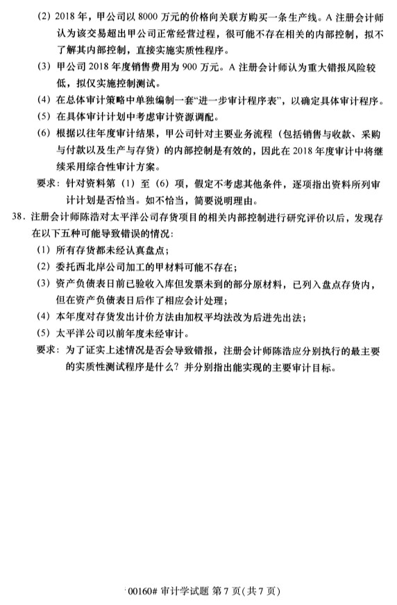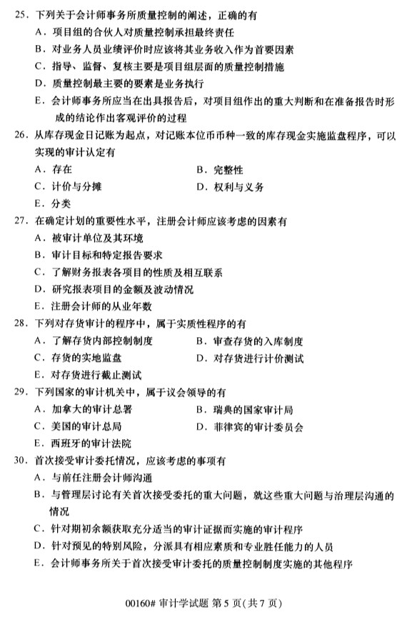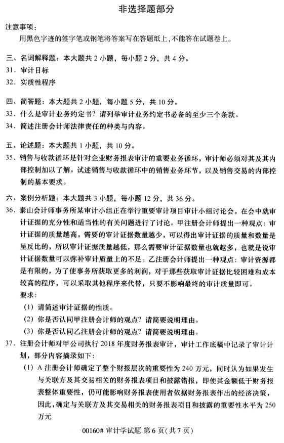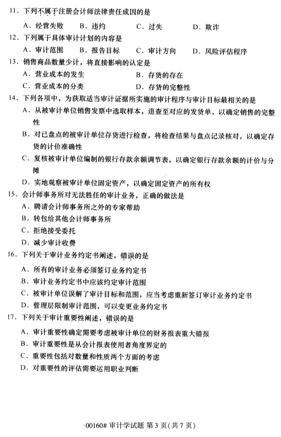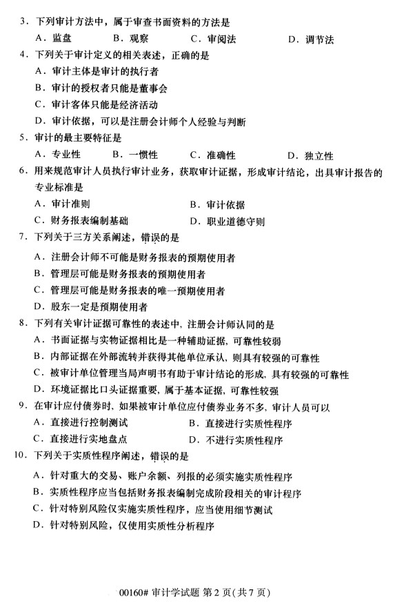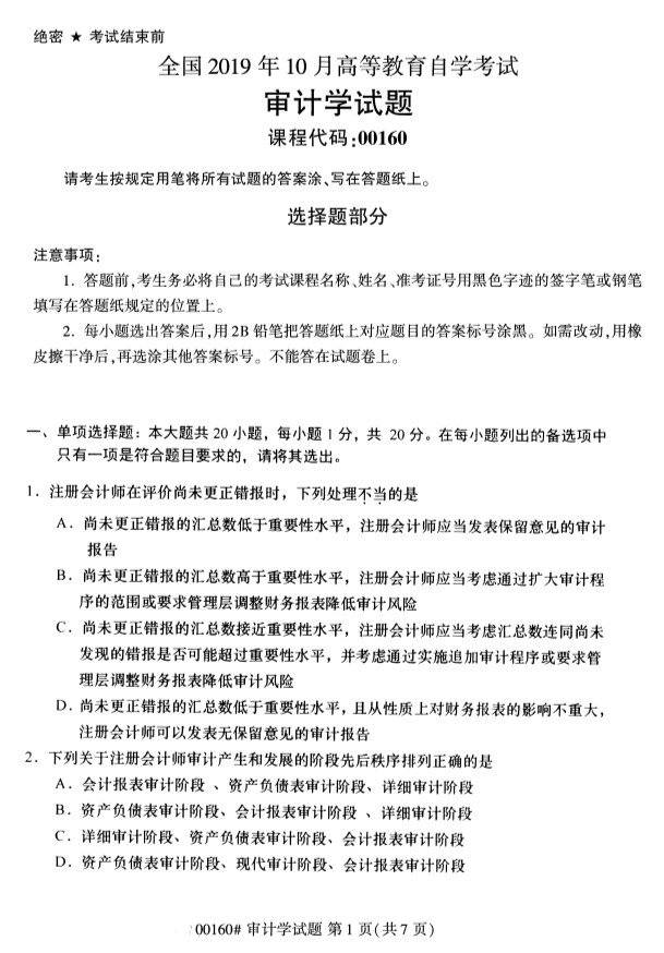 全国2019年10月自考00160审计学试题