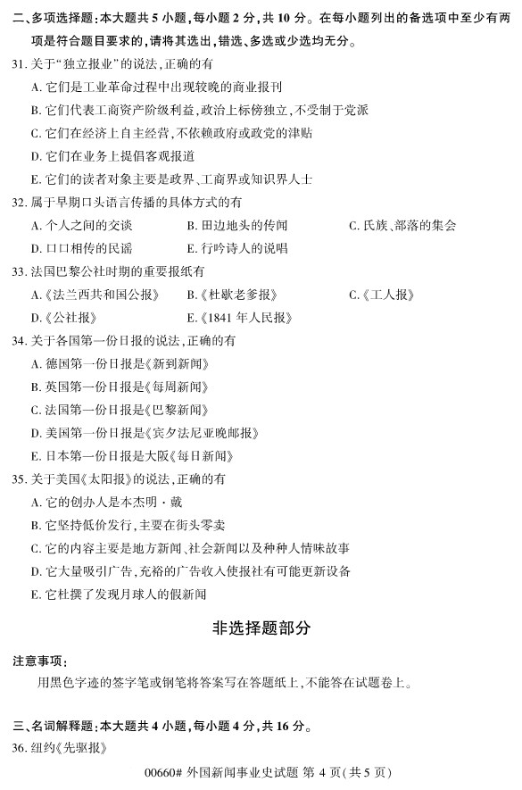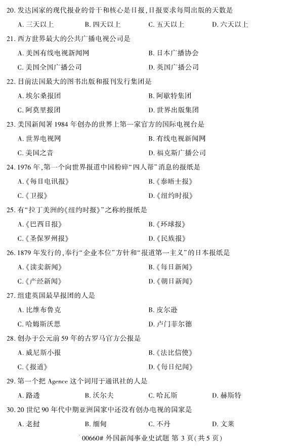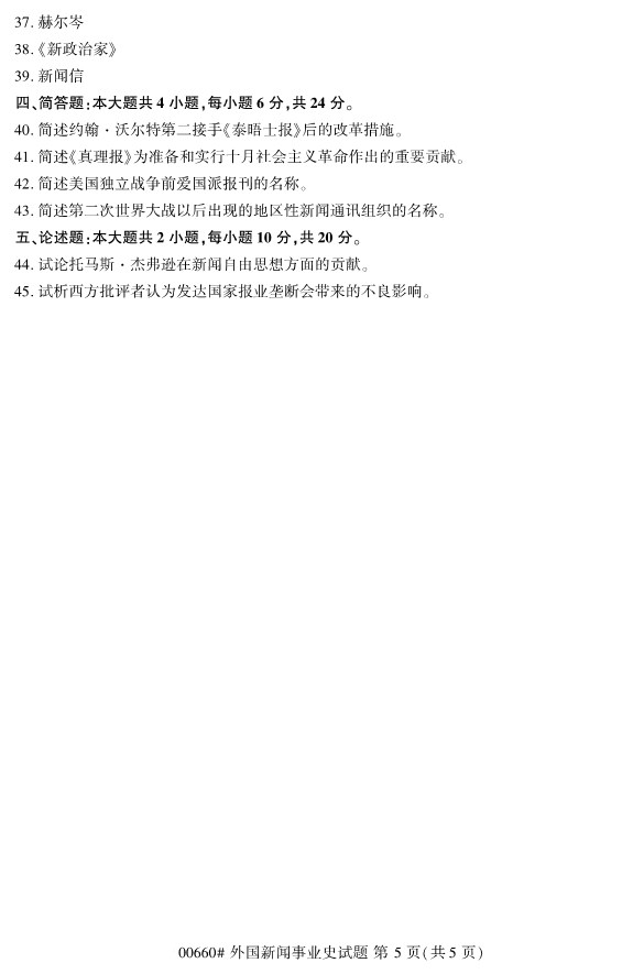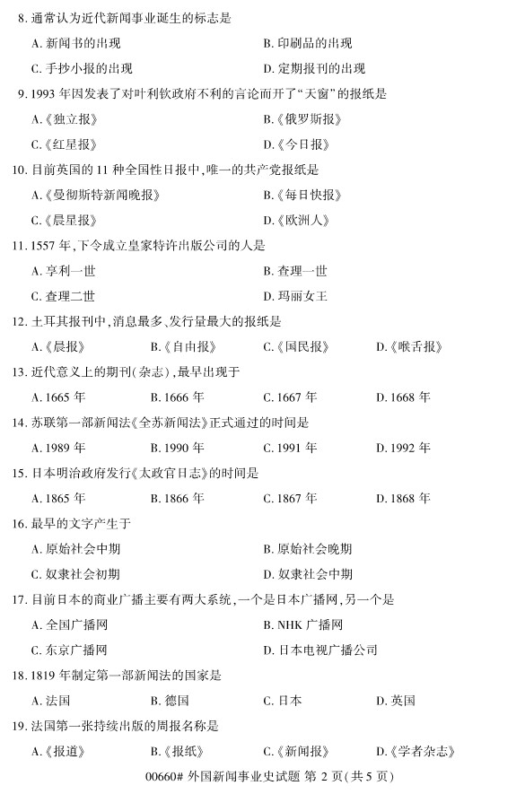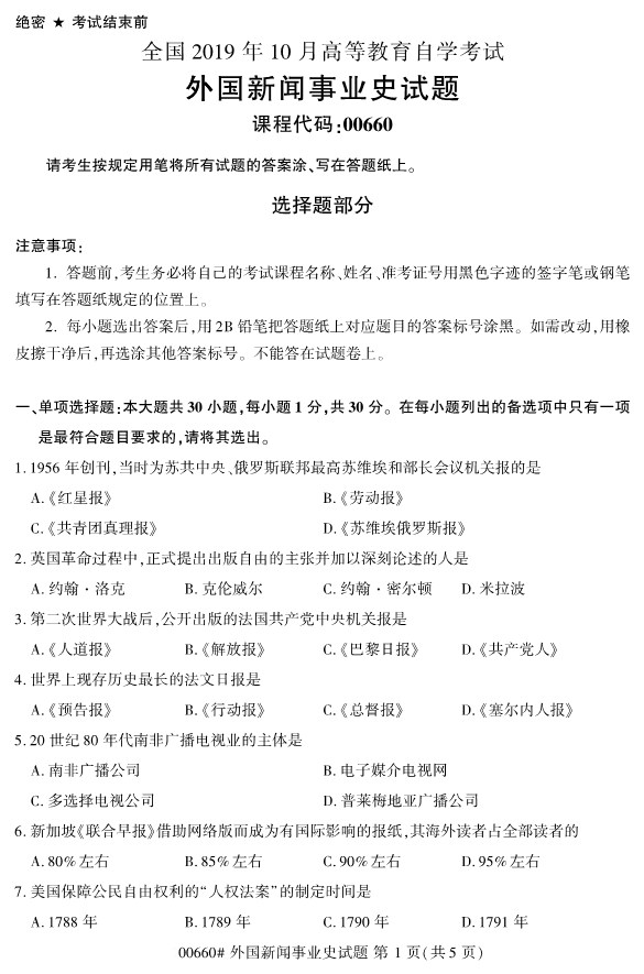 全国2019年10月自考00660外国新闻事业史试题