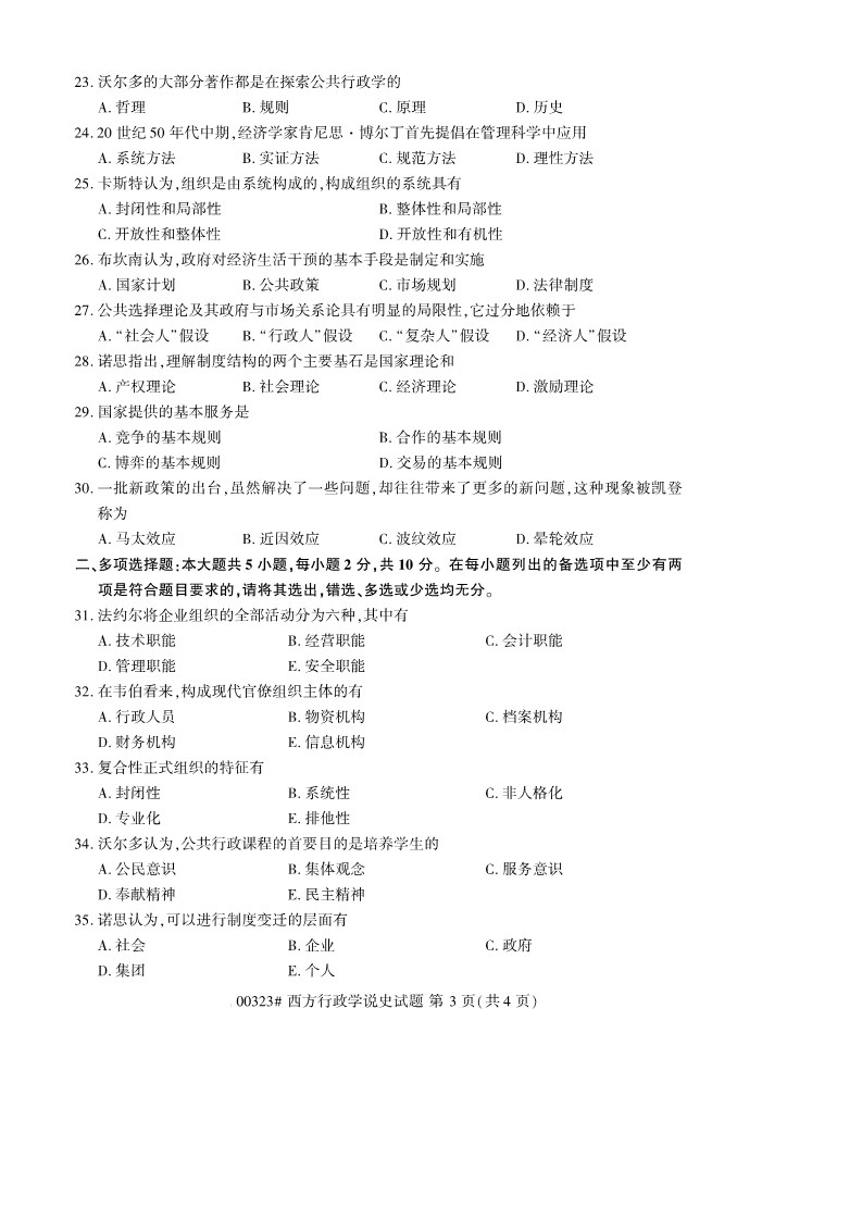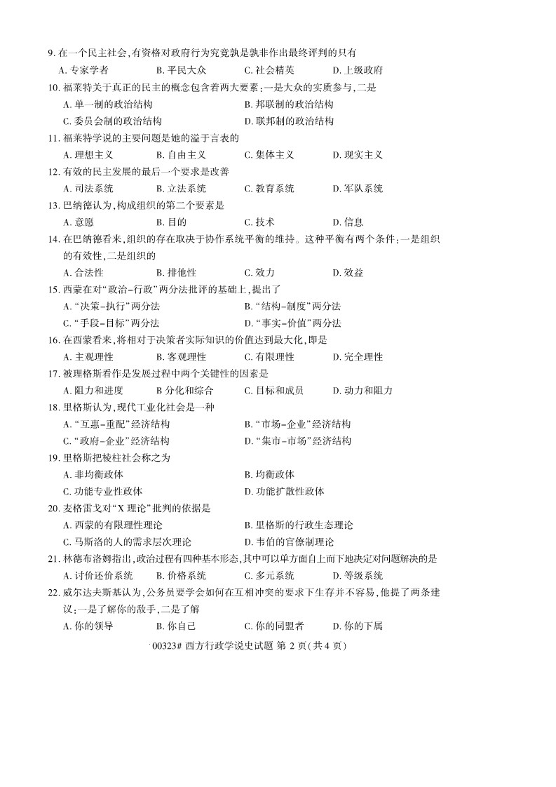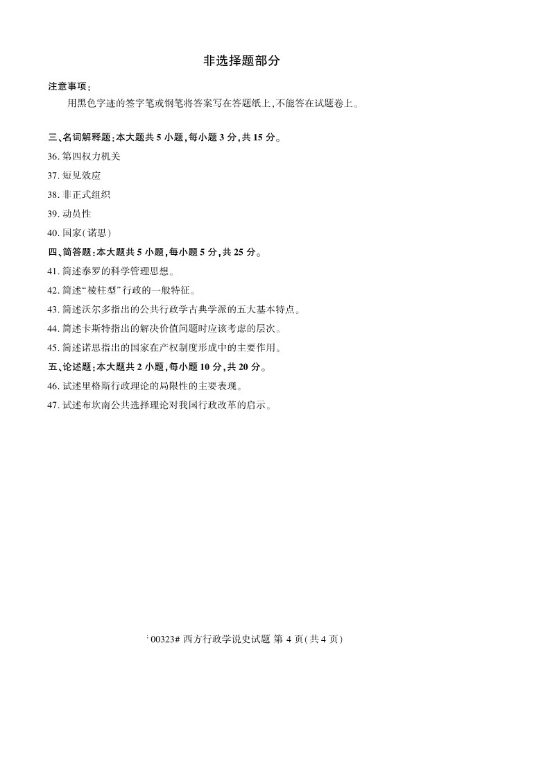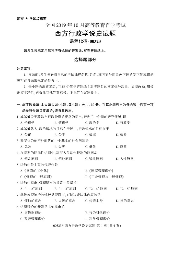 全国2019年10月自考00323西方行政学说史试题