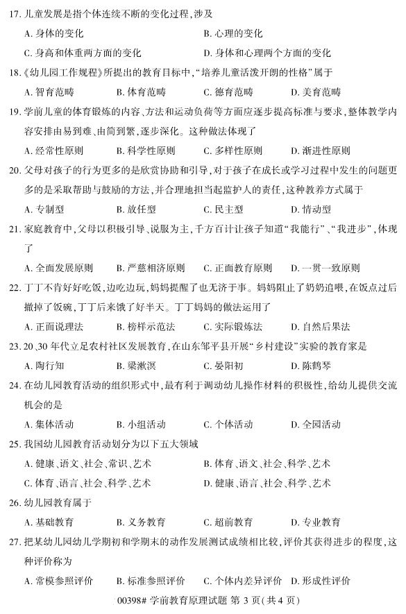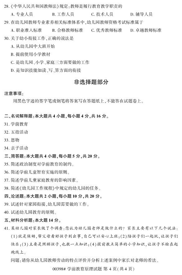 全国2019年10月自考00398学前教育原理试题