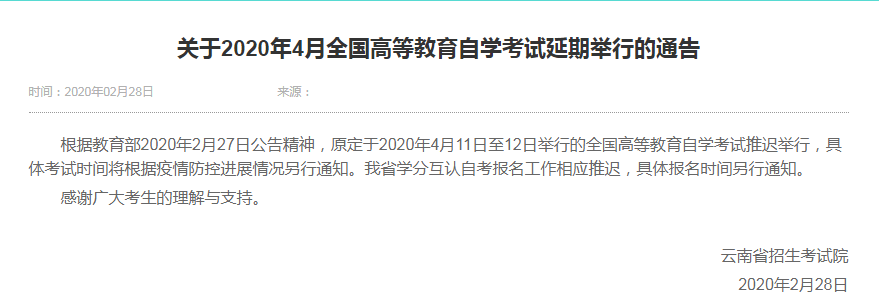 根据党中央、国务院关于新型冠状病毒感染的肺炎疫情防控工作有关指示精神和教育部相关通知要求,现结合疫情实际,经研究,原定于2020年4月11日至12日举行的全国高等教育自学考试推迟举行,具体考试时间将根据疫情防控进展情况另行通知。